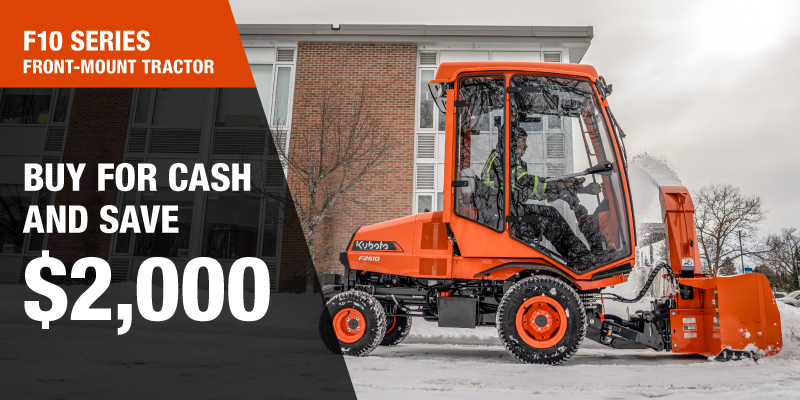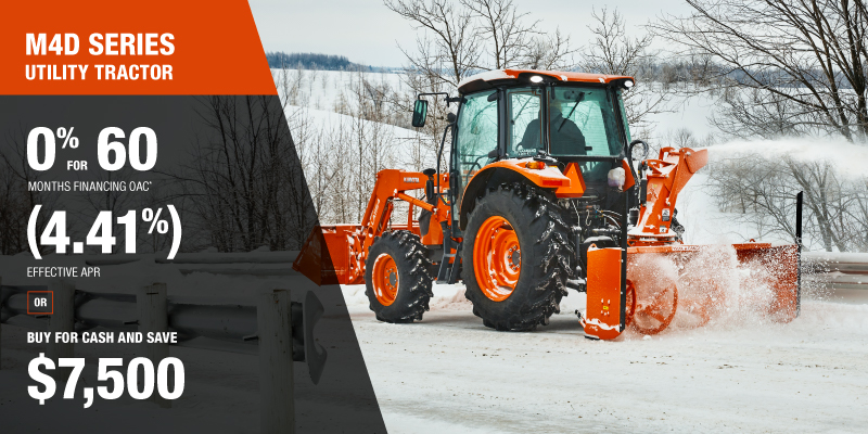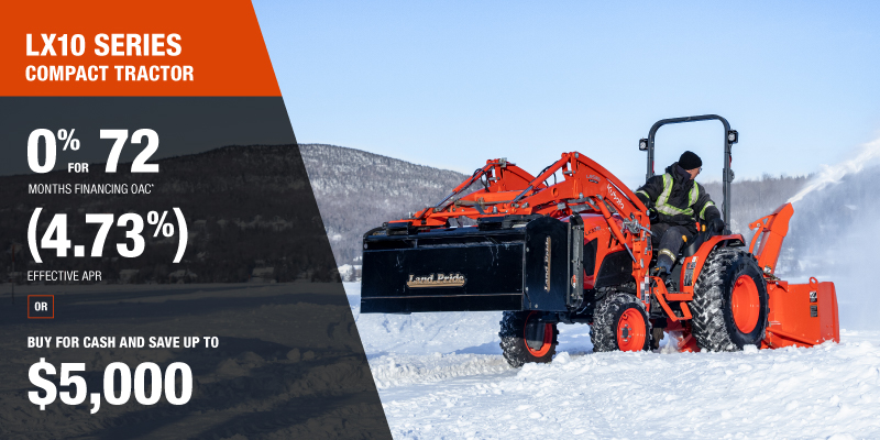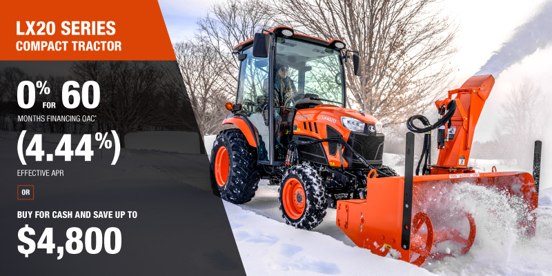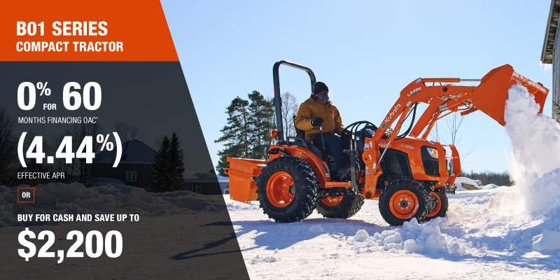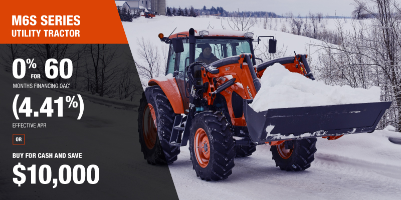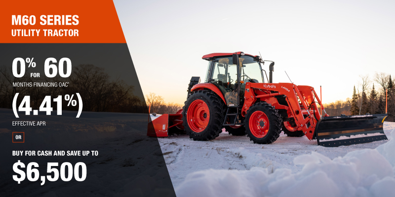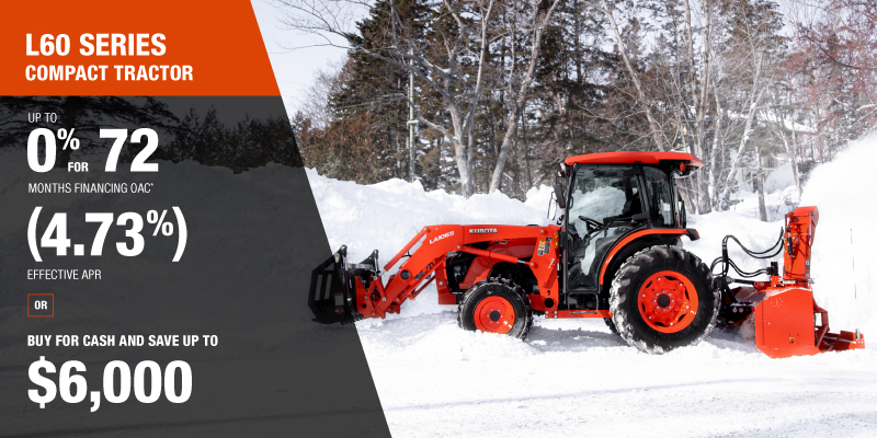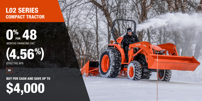 *For all offers: Prices and payments include freight and other applicable fees (including environmental fees, administration fees, set-up fees, and dealer fees). Taxes, delivery fees, insurance and registration are extra. Dealer may sell for less. Dealer order/trade may be necessary (but may not be available in all cases). Some restrictions apply. Offers valid only at participating dealers in Canada and are subject to change, cancellation or extension at any time without notice or obligation. Minimum down payment of 10% required for financing offers on turf and agricultural products. Specifications, features, illustrations and equipment shown are based on the latest available information at the time of publication. Some models are shown with optional accessories available at extra cost. Although descriptions are believed to be correct, accuracy cannot be guaranteed. We reserve the right to make changes at any time, without notice or obligation to specifications, accessories, materials, models, prices, payments and other information. Offer valid until January 12, 2026. See your participating Kubota dealer or visit www.kubota.ca for complete details.
