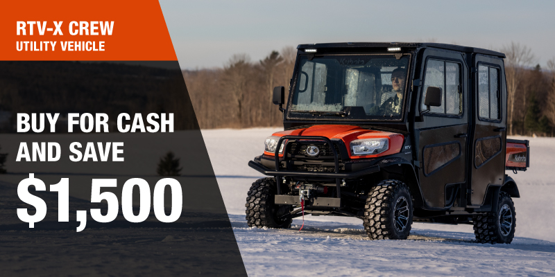 Rebate of $1,500.00 available on cash purchases of a new RTV-X Crew only. Offer valid until 03-31-2026.